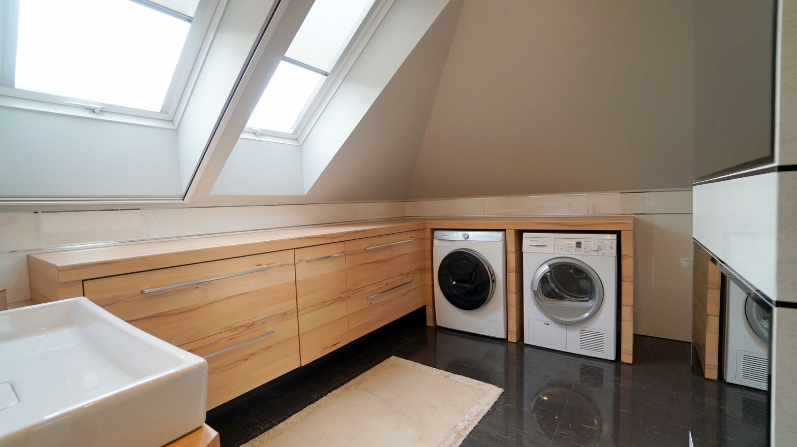 Dom zachwyca wysokiej jakości materiałami. Na podłogach znajdziemy elegancki marmur oraz granit, które nadają wnętrzom wyjątkowego charakteru. Naturalny akcent podkreśla ogrodzenie oraz elementy w ogrodzie wykonane z trwałego łupka.